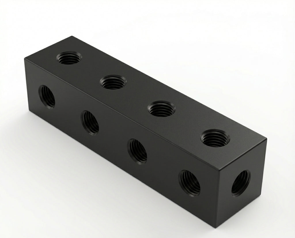 8mm square aluminum bar with M4 tapped holes on all four sides (aligned). Available in 4-hole length with tapped ends for end-to-end connections. Lightweight, strong structural solution for FTC/FRC robotics with M4 tapped holes.